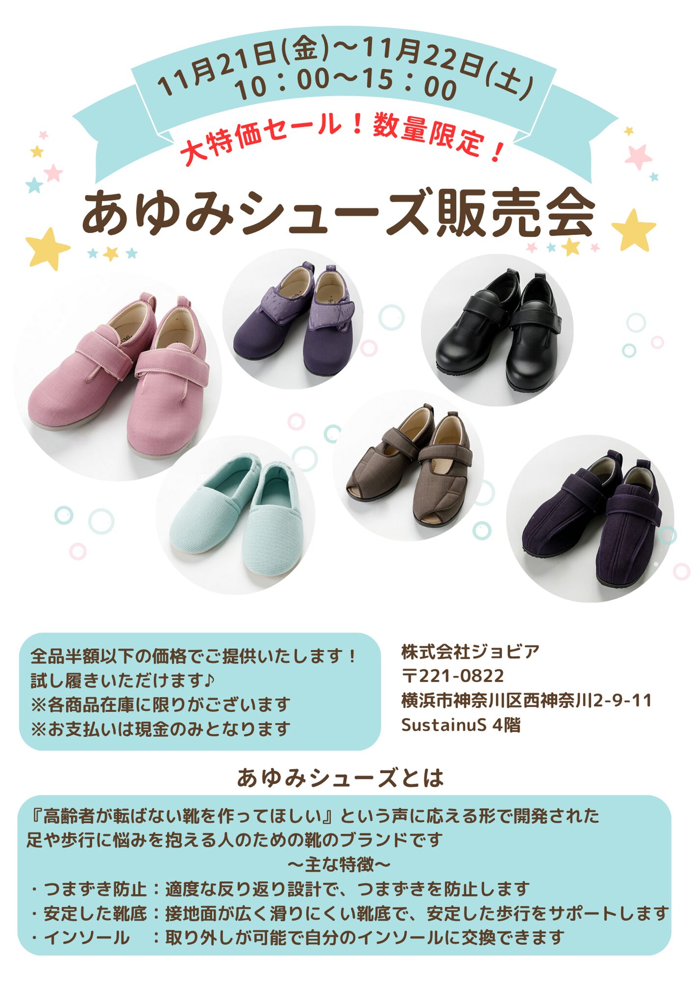 11/21~11/22 2日間限定であゆみシューズの販売会を東白楽にあるジョビア4階にて開催いたします。 現品限り全品半額以下でのご提供!是非ご来社ください♪ -