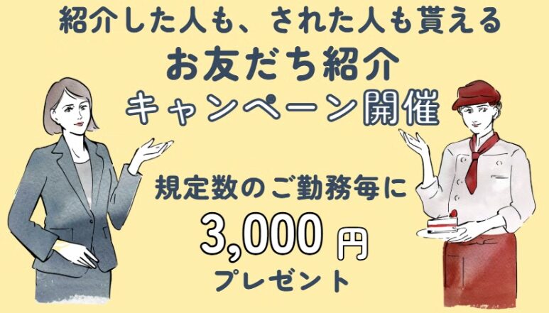 \紹介した人も、された人も貰えるお友達紹介キャンペーン開催中/ 紹介したお友達が期間中に新規登録をされ一定数のご勤務毎にご紹介者とお友達それぞれに3,000円をプレゼントします [プレゼント内容] キャンペーン期間202 […] -