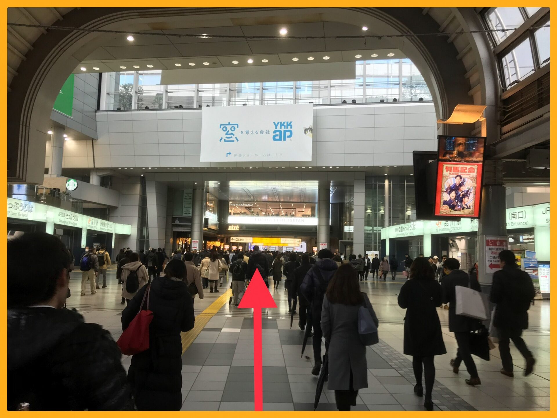 ①JR品川駅中央改札を出て、右に進みます(北改札から出た場合は、左へ)