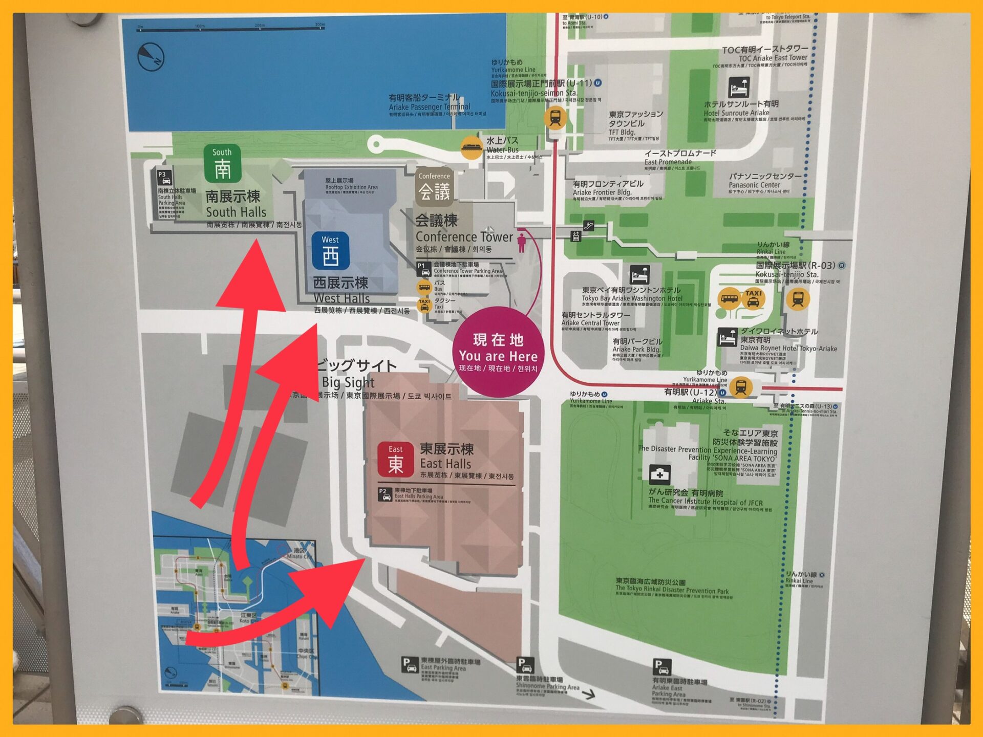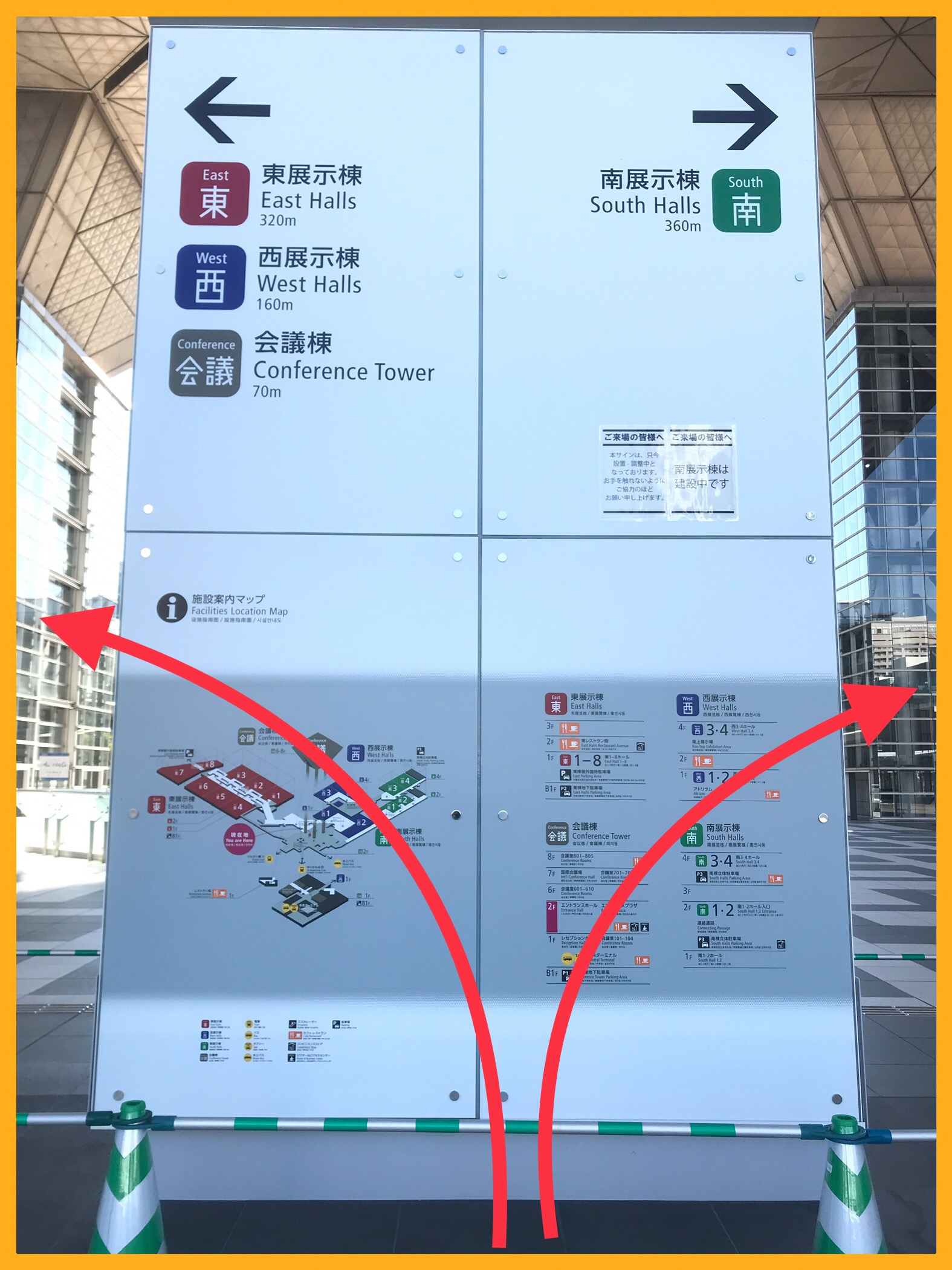 ③中に入ると、東展示場、西展示場、南展示場、会議棟と4つに分かれていますので指示された展示場に、向かってください。↓