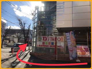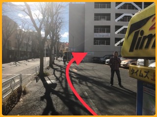 ④パチンコ屋さんの前を通り建物に沿って右に曲がります。