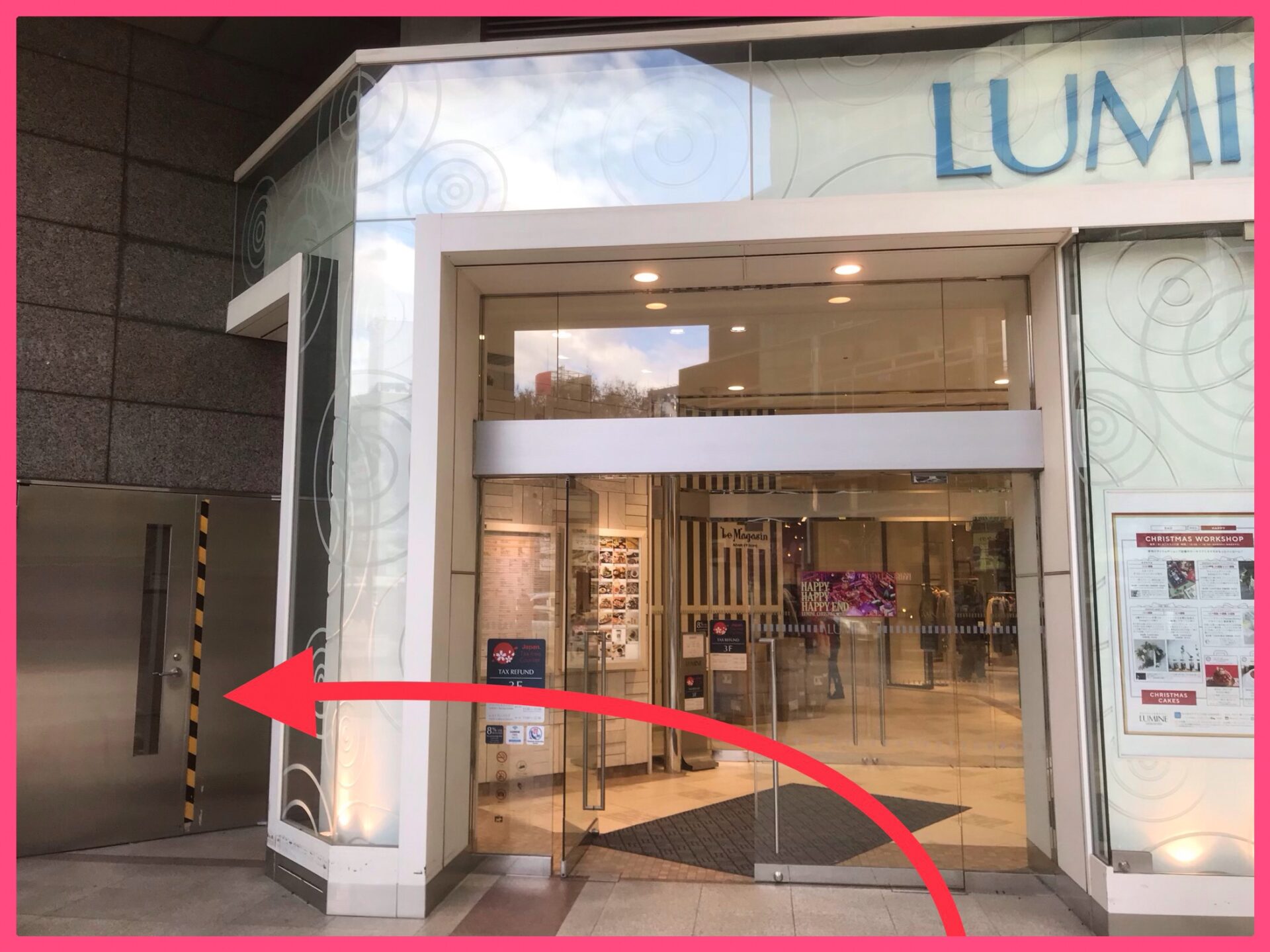 ルミネ 池袋店 投稿日 2019.02.05 更新日 2025.09.03 著者 prismgate 商業施設 ルミネ ①池袋駅地下鉄 、JR共にルミネ出口に向かいエスカレーターを上ります。 ②エスカレーターを上りきると目の前にメガネドラッグが見えます。 ③左を向くとルミネ池袋店のお客様出入口があります。 ④お客様出入口の左にある銀の扉が従業員入口(通用口)です。 お仕事をお探しの方は LINE登録 人材をお探しの方は 企業担当者さまへ
