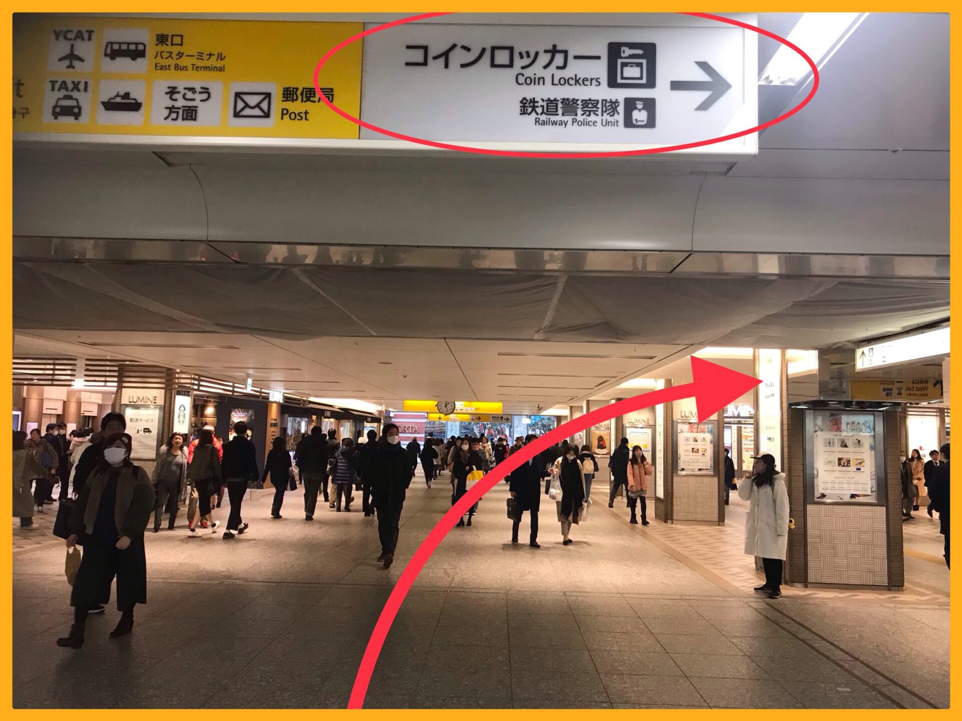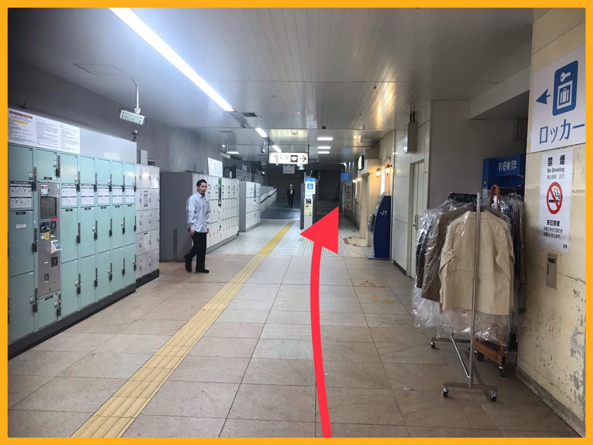 ②右側にルミネ横浜店が見えます。手前にコインロッカーの看板が出ます。それを目指して右へ曲がって下さい。↓