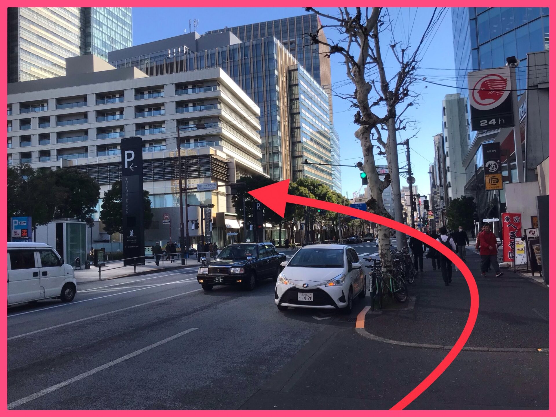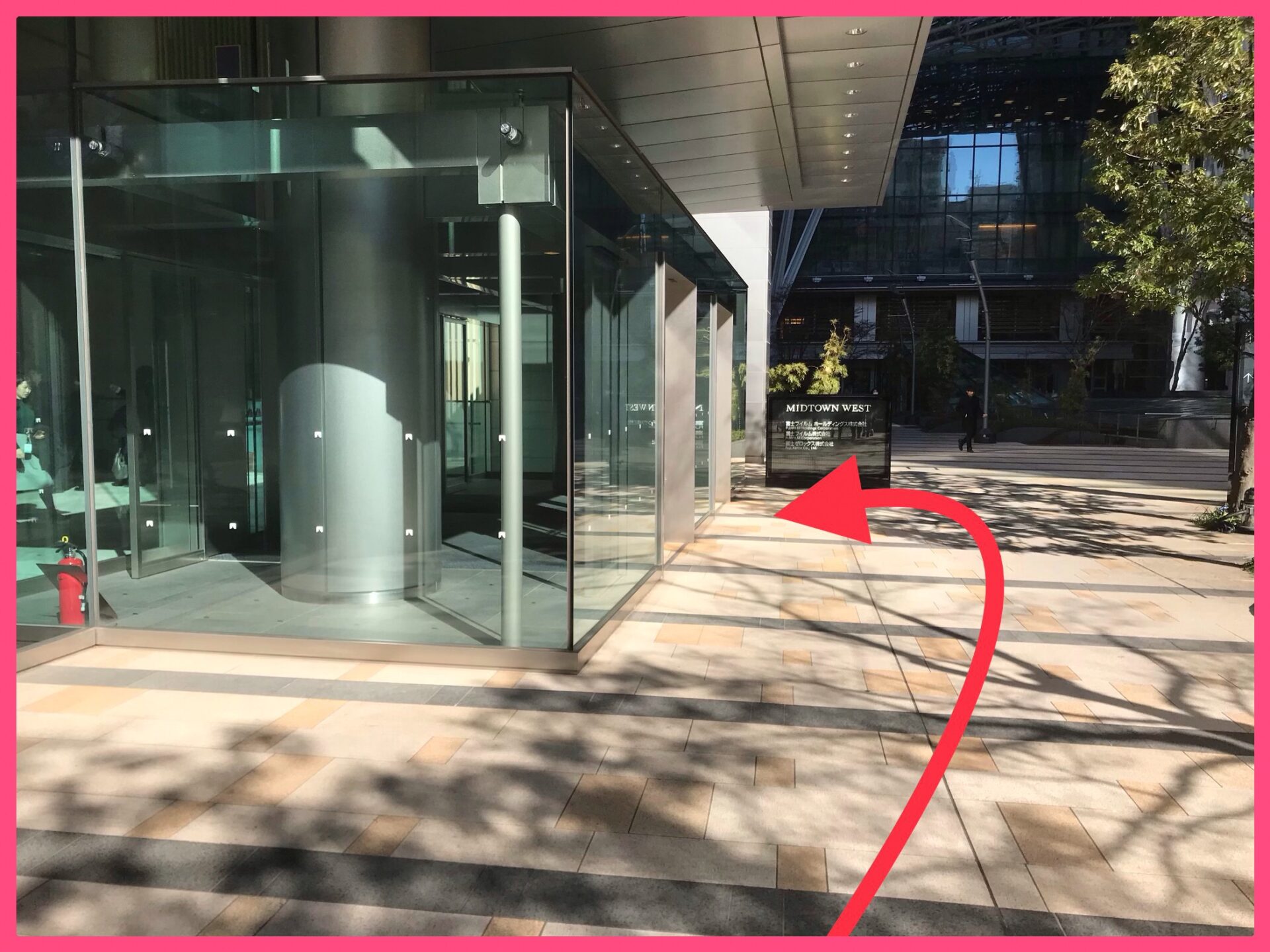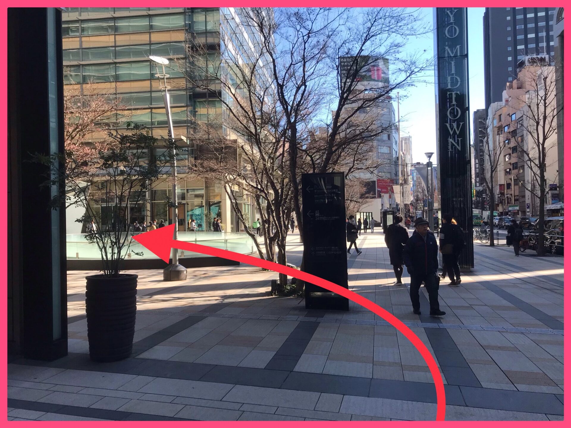 ③しばらく進むと左側に東京ミッドタウンが見えてきます。横断歩道を渡って前まで行きます。↓