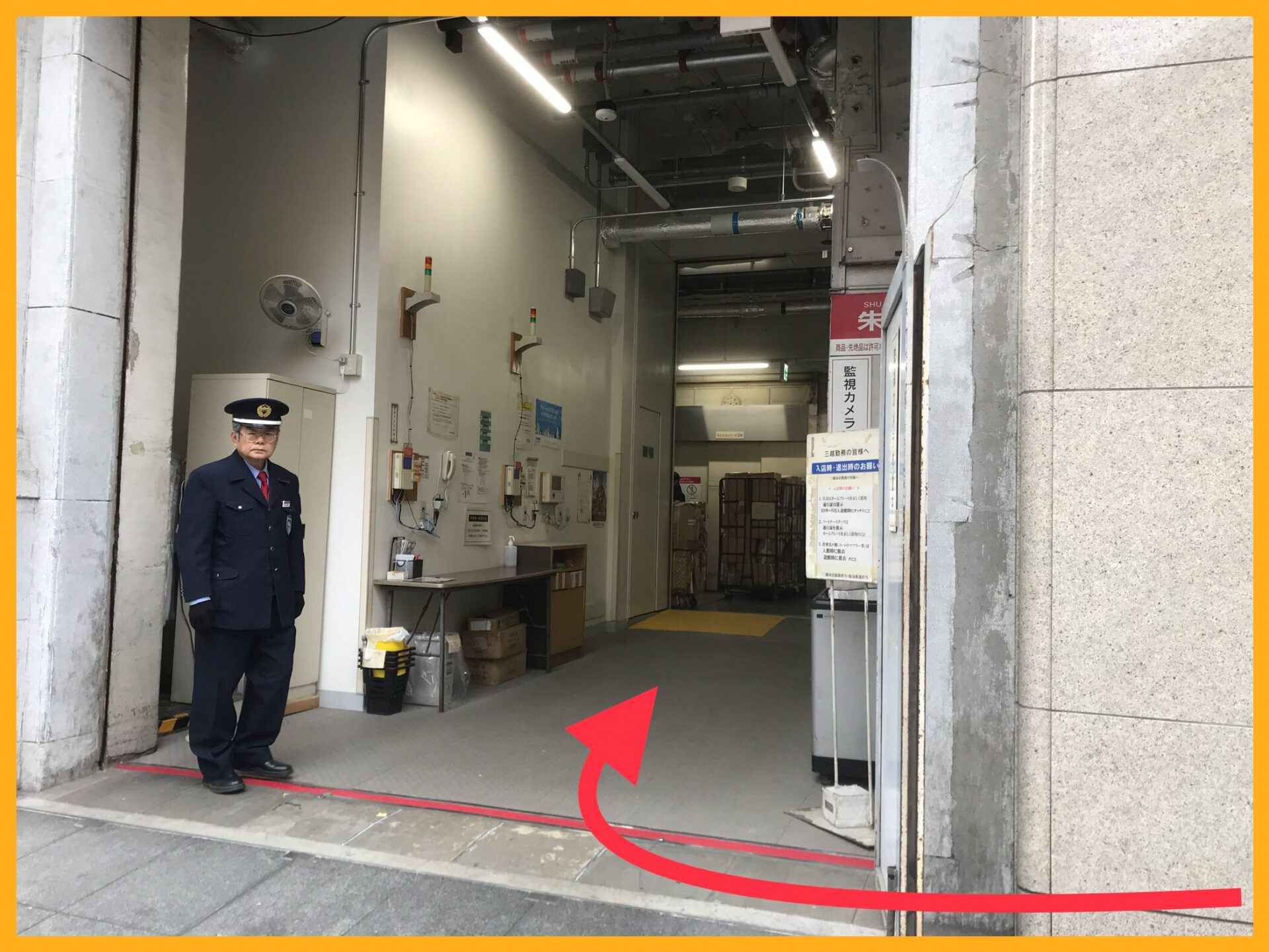 新館の正面入り口(日本橋口)を正面に見て壁沿いを左方向に10mくらい進むと、右手に従業員入り口があります。新館正面入り口は日本橋から歩いてスターバックスのある交差点の通りの反対側に従業員通用口があります。