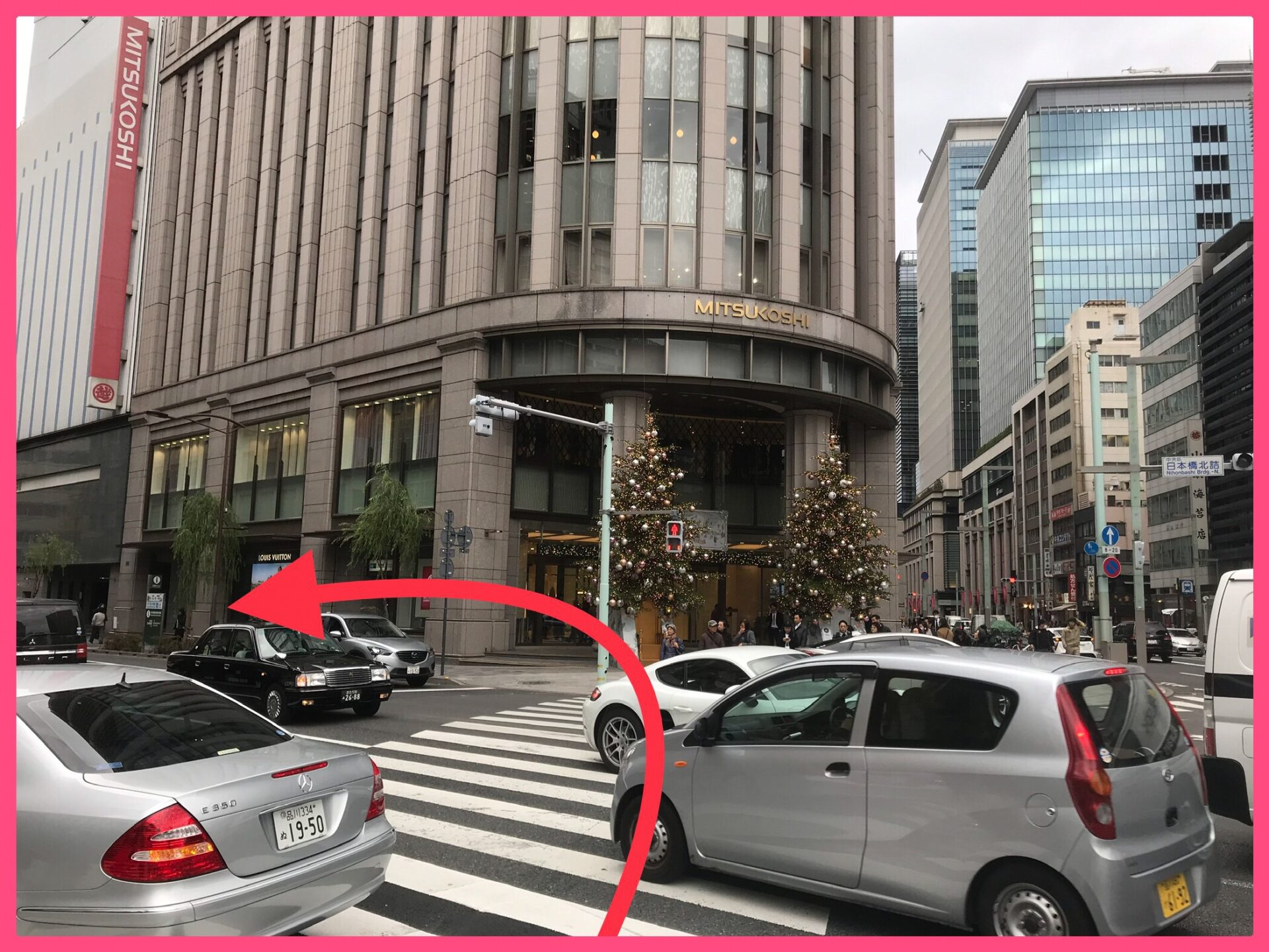①東京メトロ銀座線・半蔵門線三越前駅を出ると直ぐに三越日本橋店があります。本館のライオン像を正面とした場合、建物の裏側にありますので、建物沿いに時計回りでも反時計回りでも行けます。
