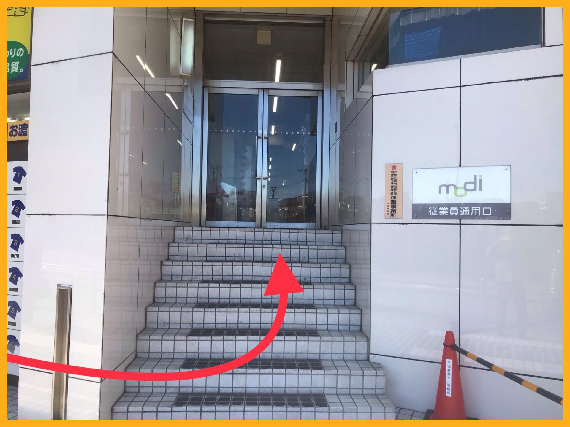 モディ 戸塚店 投稿日 2019.02.06 更新日 2025.09.02 著者 prismgate 商業施設 モディ ①JR 戸塚駅の改札を出て東口に進みます。 ②5 番出口の階段を上り左に進みます。 ③建物に沿って左に進んで行くと、戸塚モディ従業員通用口があります。 お仕事をお探しの方は LINE登録 人材をお探しの方は 企業担当者さまへ