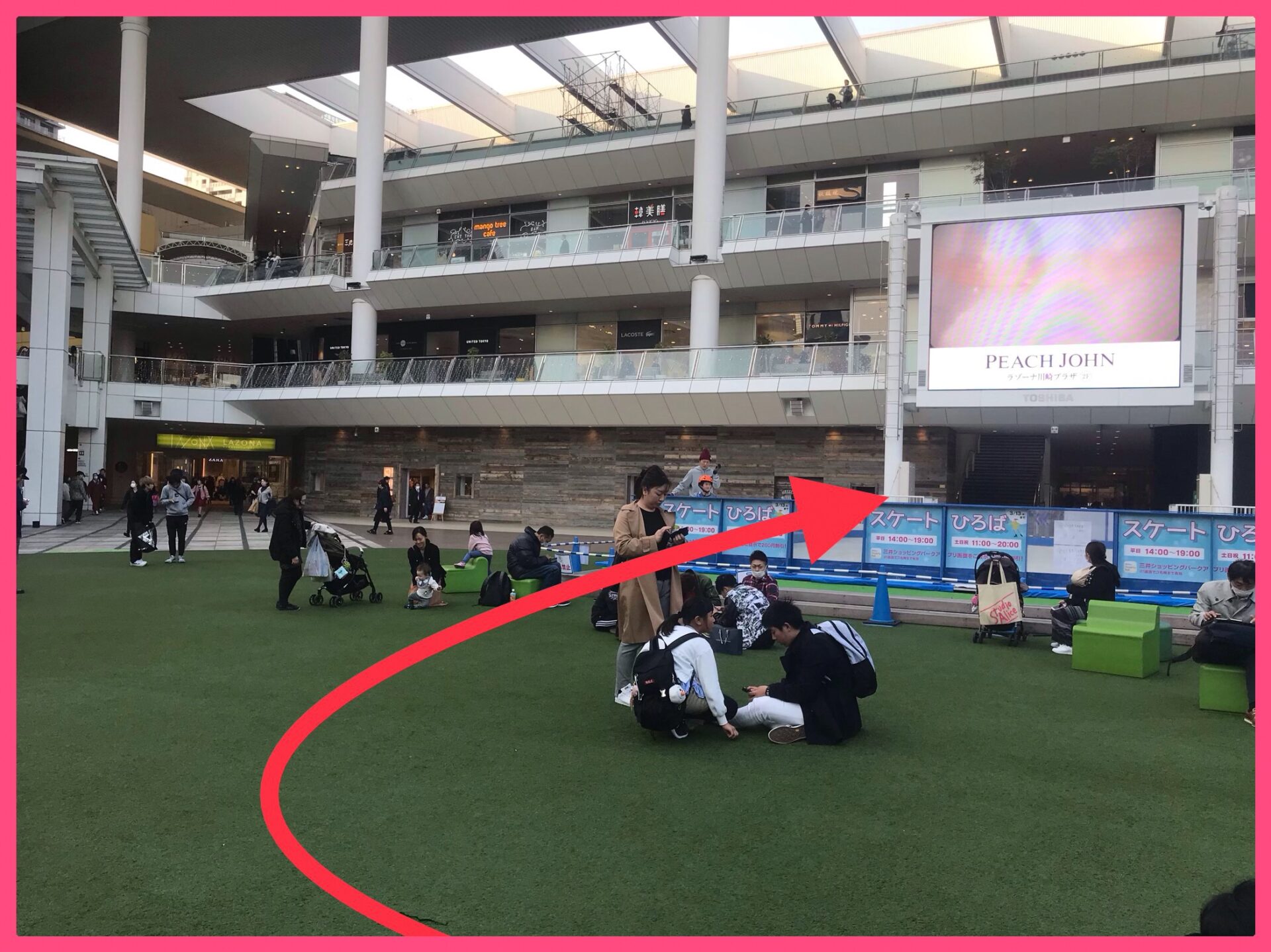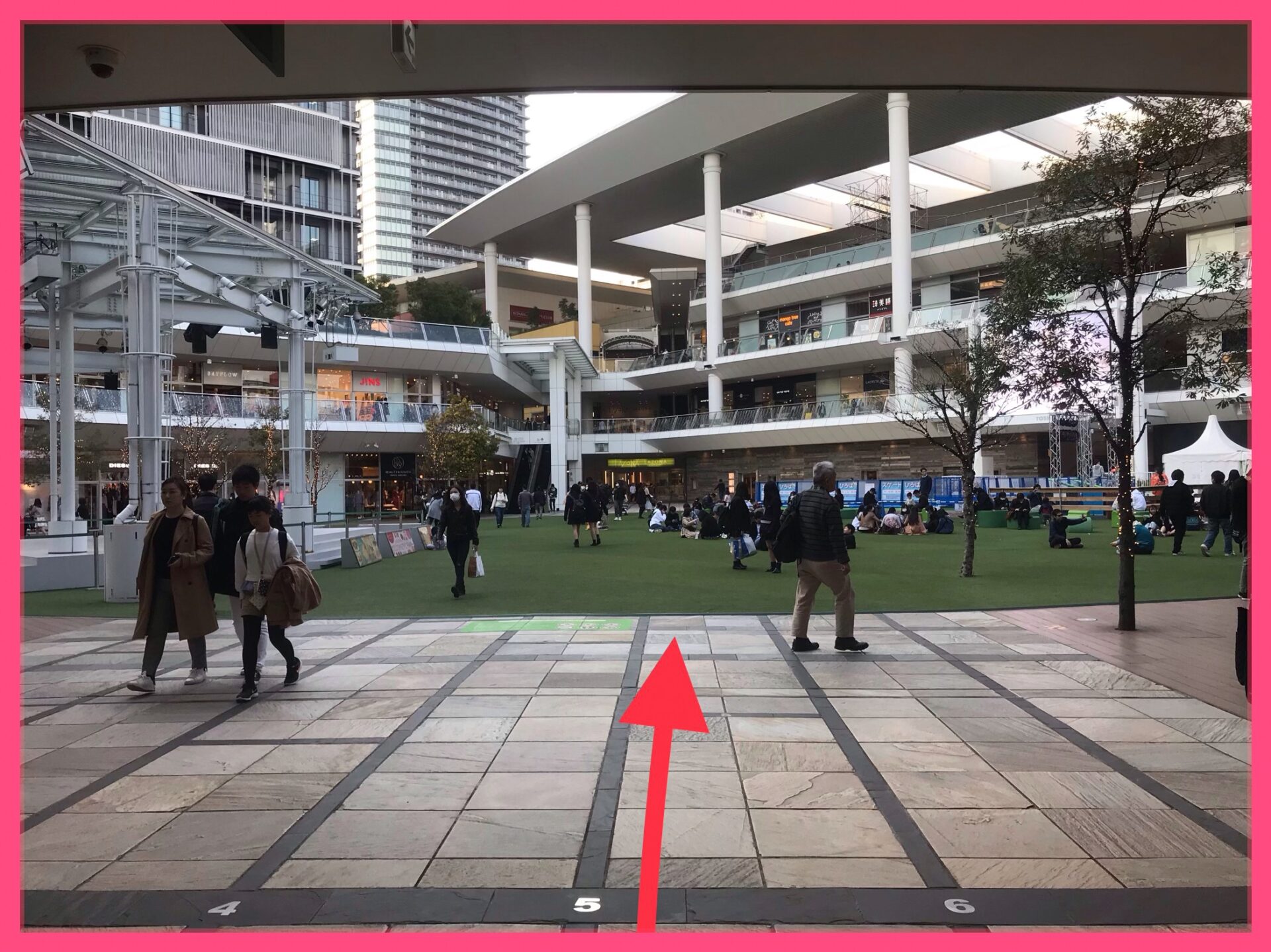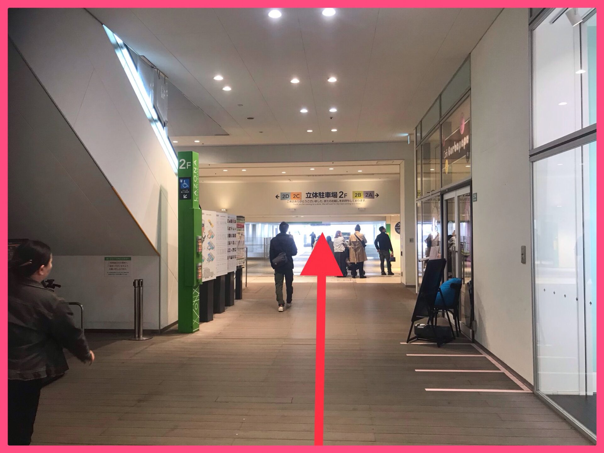 ③中央広場から大きなスクリーンの下から立体駐車場2の方向へ進みます。