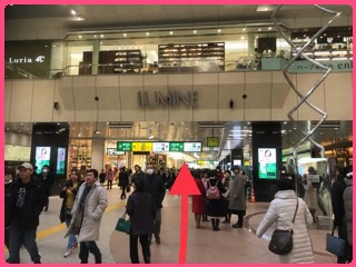 ①中央改札・北改札・南改札から中央自由通路に出て、西口方面に向かいます。