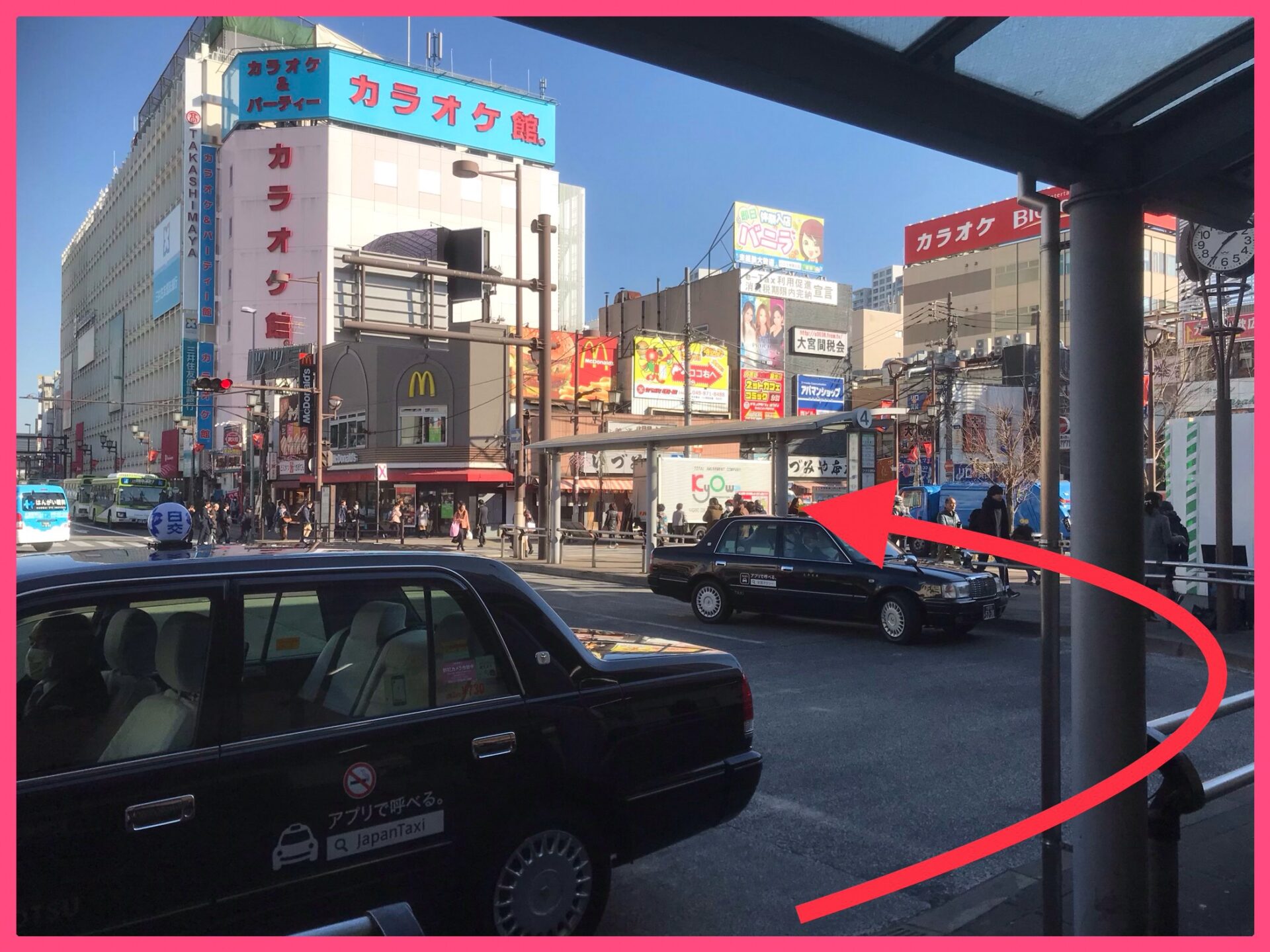 ②タクシー乗り場の先にカラオケのビッグエコーが見えます。