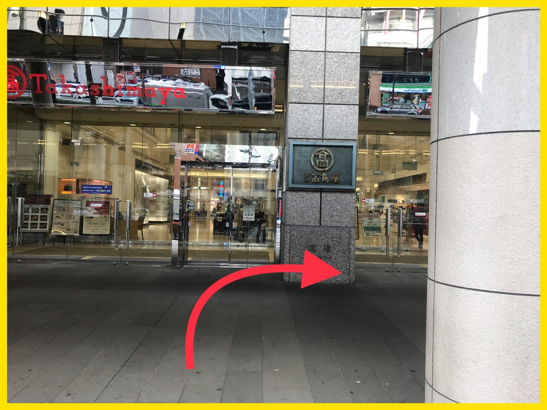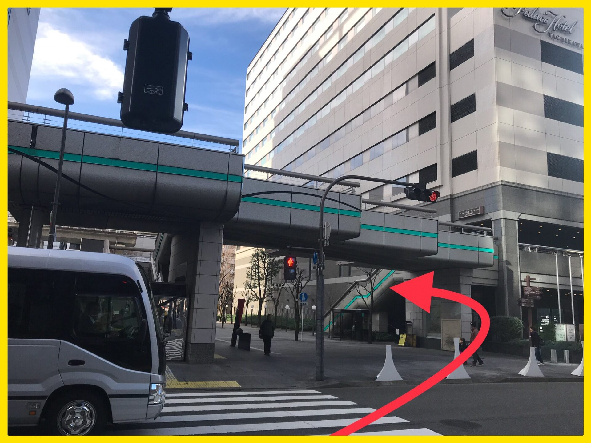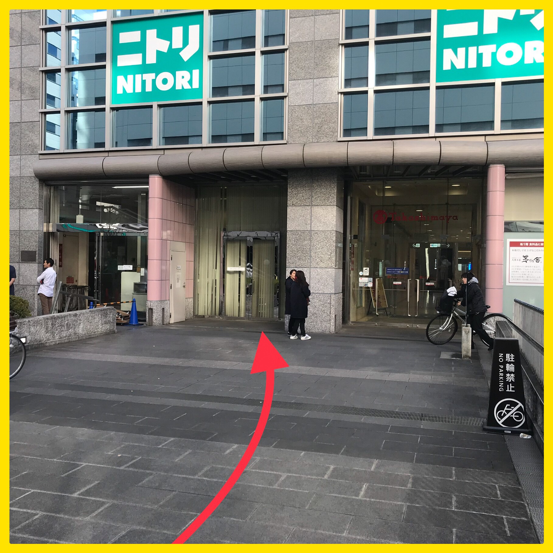 ①JR立川駅改札を出て北口に向かいますと、高島屋立川店が見えます。高島屋立川店の正面口の真裏のパレスホテル口の近くに従業員通用口がありますので、正面口を建物に沿って反時計回りに回って下さい。