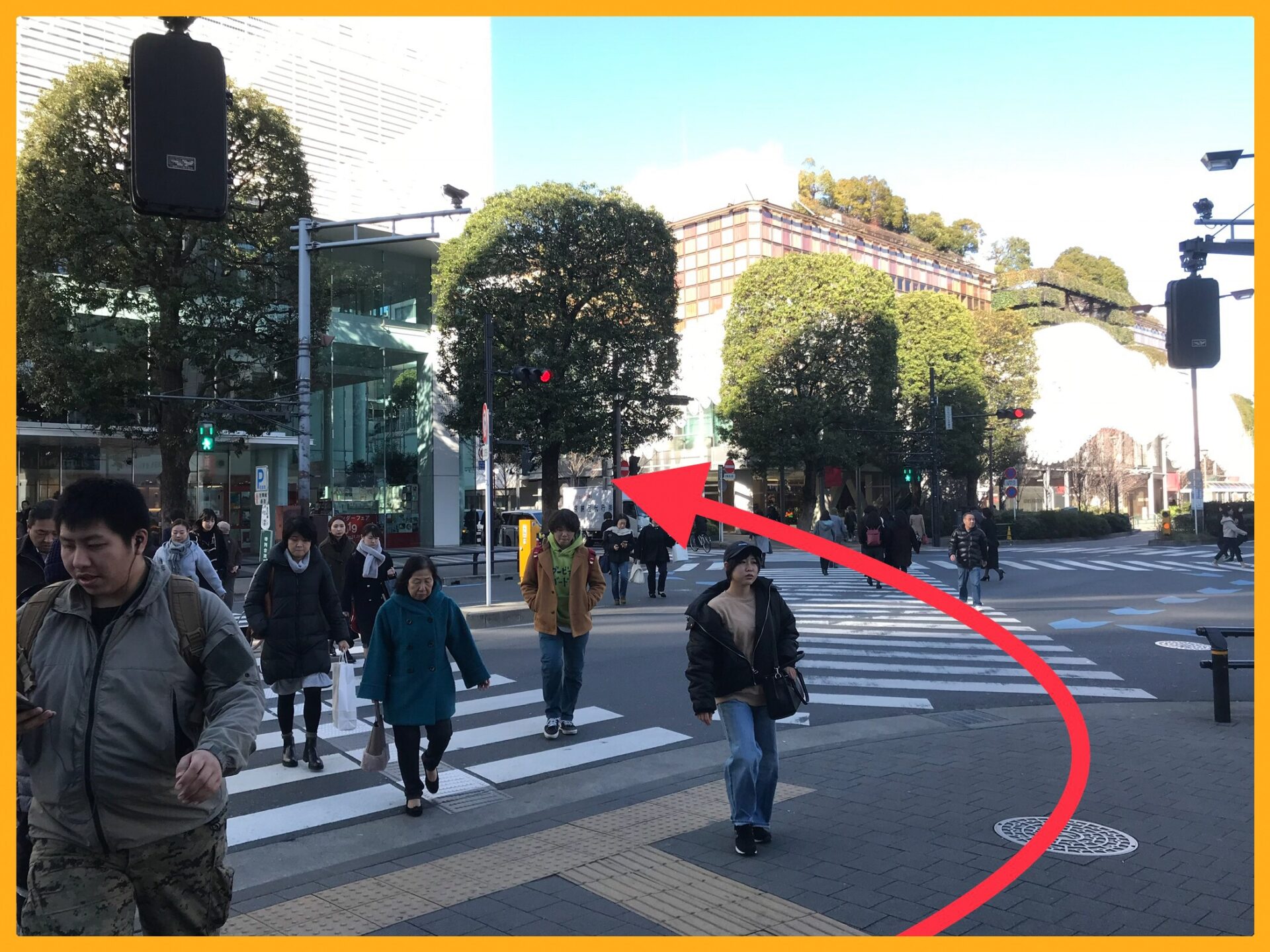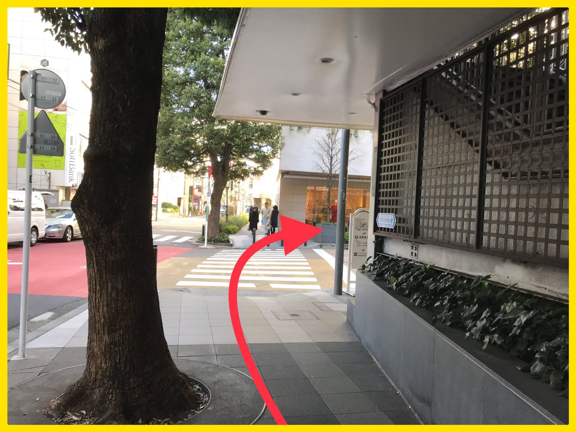 ②西口を出て右に進むと横断歩道がありますので、右斜め前方に進みます。