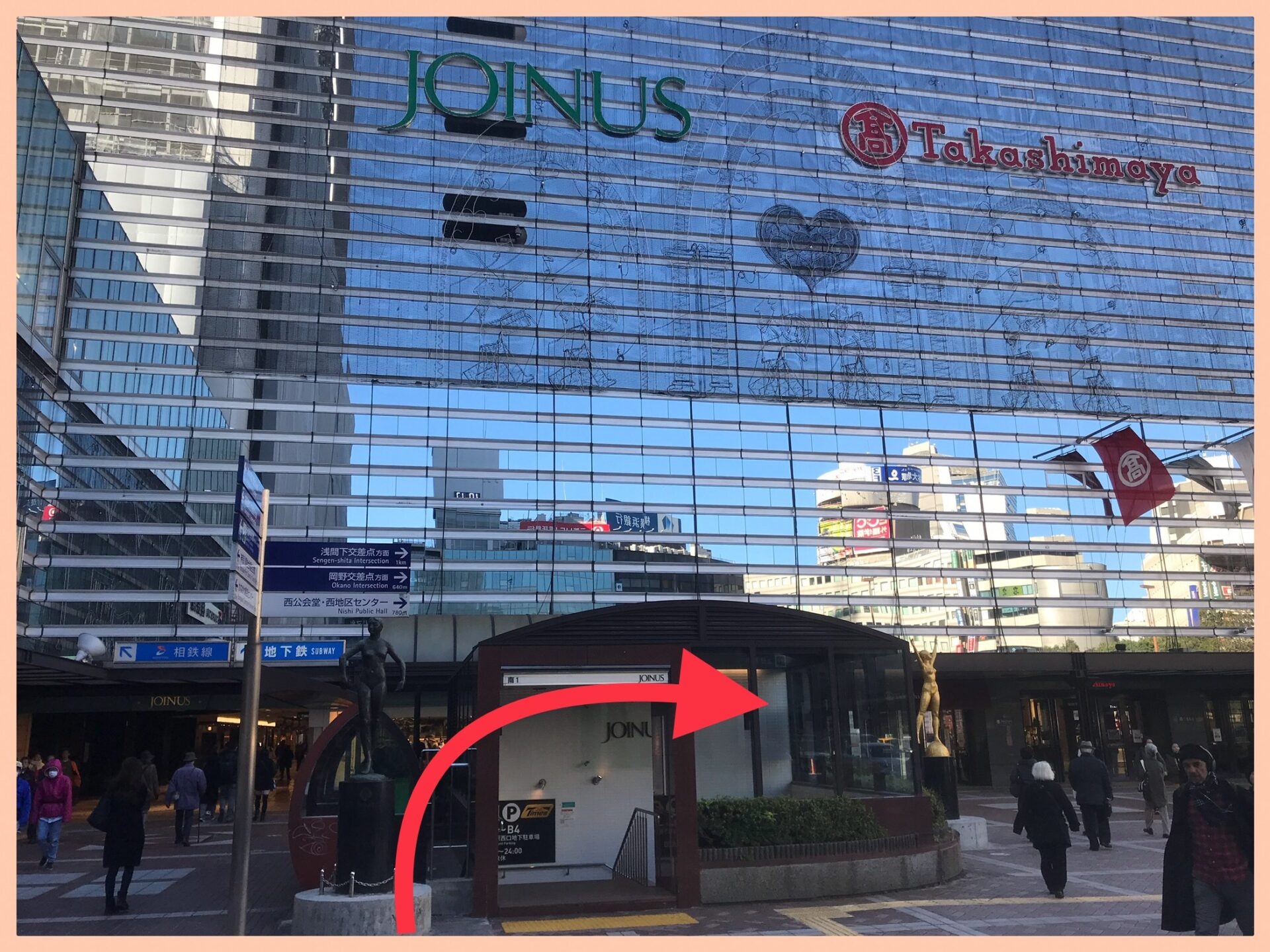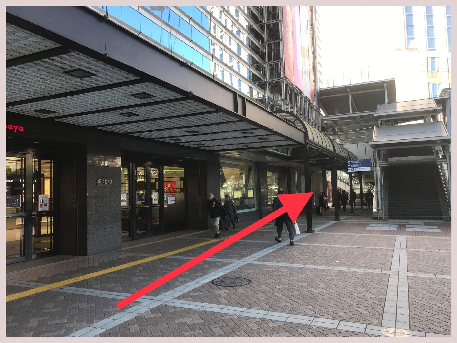 ②西口を地上に向かいますと左側に髙島屋横浜店が見えますので、髙島屋の正面入り口の方向に進みます。