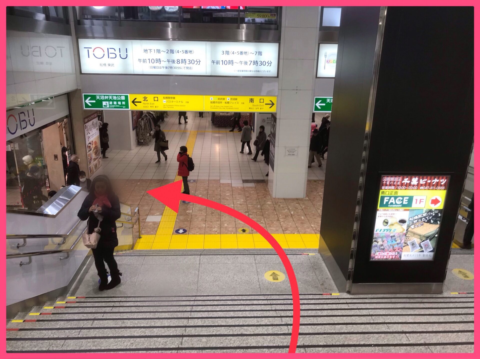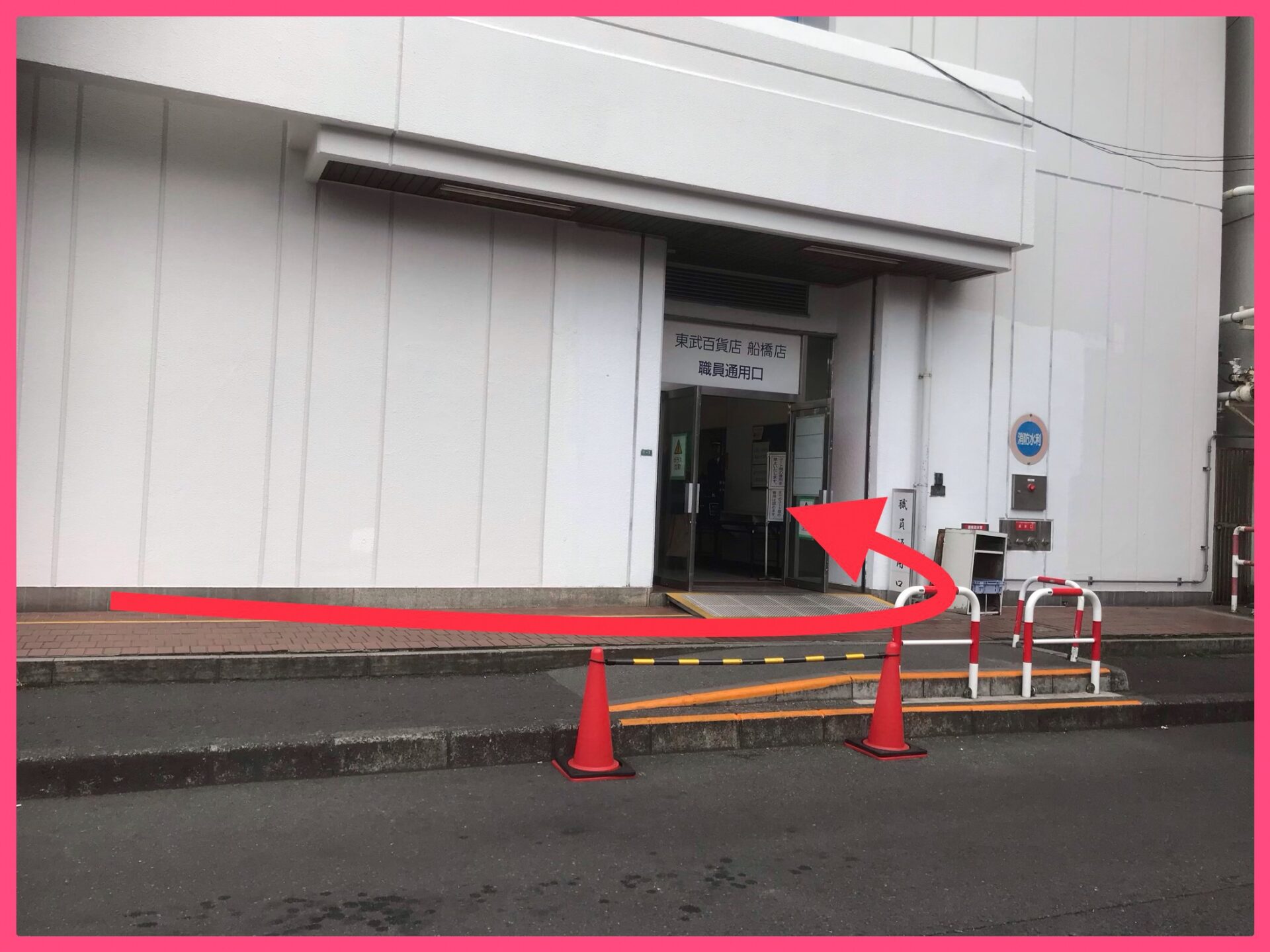 東武百貨店 船橋店 投稿日 2019.02.05 更新日 2025.09.03 著者 prismgate 商業施設 東武 ①JR船橋駅改札を出て北口方面へ向かいます。 ②北口を左に曲がり東武百貨店船橋店の建物に沿って反時計回りに進みます。 ③荷物運搬口の先に従業員通用口があります。 お仕事をお探しの方は LINE登録 人材をお探しの方は 企業担当者さまへ